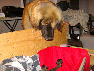 Some cute pictures of the pups and how they sleep. The one of them alltogether only has 6 of them ! Sadie so wants to be with the pups that she pulled out her pig toy. She carries it around in her mouth and lays with it too. She is a good grandma. Kramer meeting the pups. It was so funny he licked the pup and it peed. Well he started foaming and spitting it out. Kramer does not do clean up lol.
